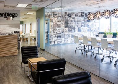 Creative Builds was thrilled when Design X Architecture approached us to work on San Diego Magazine’s office overhaul. The once stark space was redesigned to match the magazine’s brand and the spirit of the city it represents – with a color palette inspired by the ocean and a collection of art work replicating the covers of past editions. This office remodel included not only a change in paint color and flooring, but a complete overhaul of the conference room, kitchen, reception and common areas. A major change took place in the kitchen, where we turned a once closed off space into an open, collaborative workspace – by knocking down several walls and taking over an adjacent office. We were excited to be part of this renovation that gave the members of the San Diego Magazine team a place that reflects their creativity.